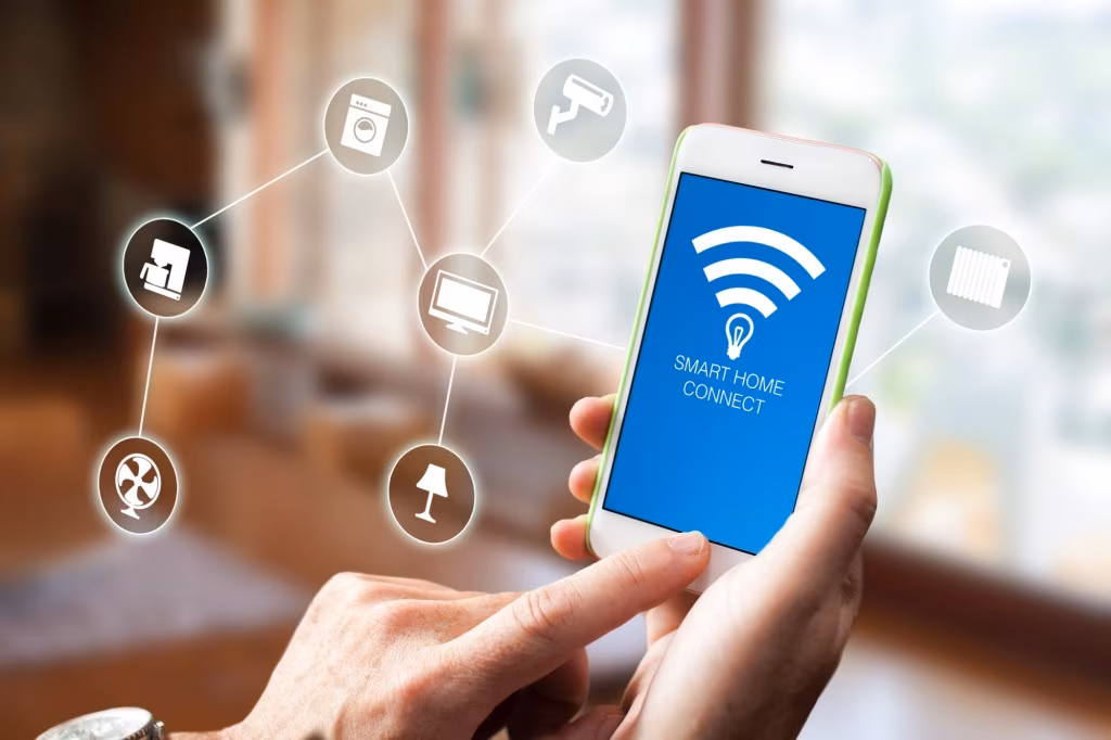 Using smart home app on phone. Smart home, remote control concept.