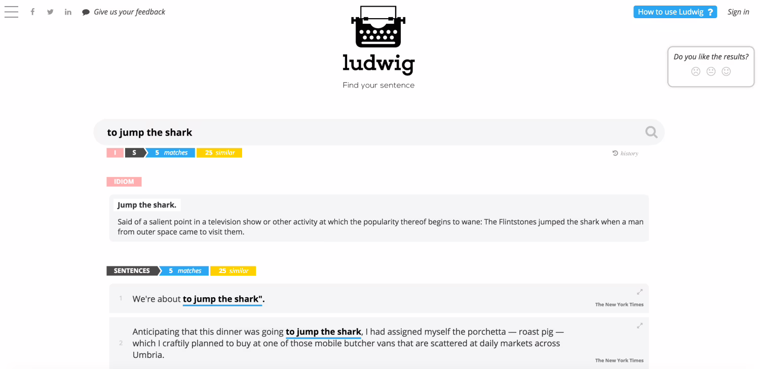 Funziona come un gigantesco dizionario interattivo, come un Google Translate, ma MOLTO più avanzato e corretto. Basta digitare una frase in inglese e il sito vi restituirà una serie di esempi provenienti da fonti autorevoli come Guardian, New York Times e BBC, pescati all’interno di un database in continua espansione.